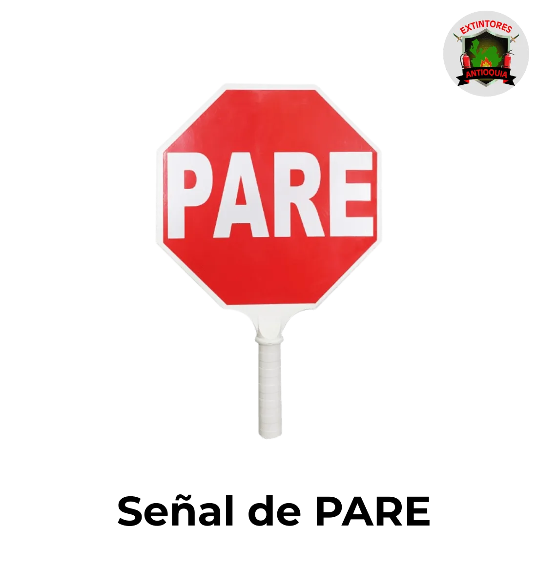 Dispositivo portátil de señalización manual tipo paleta, con la palabra PARE en letras reflectivas de alta visibilidad. Es utilizada principalmente para controlar el tránsito vehicular y peatonal de manera temporal en zonas de obra, accesos restringidos o pasos peatonales.