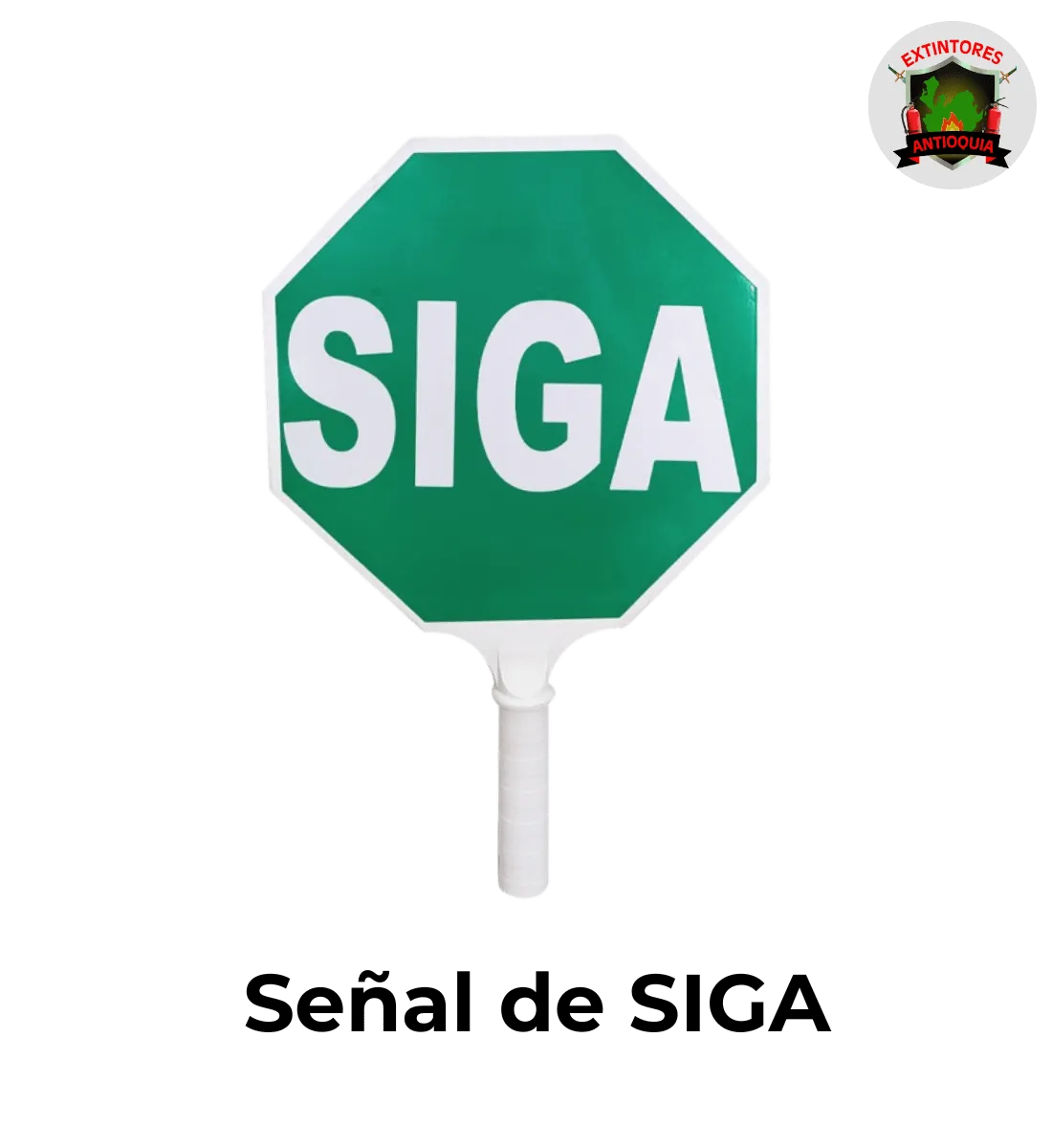 Dispositivo portátil de señalización manual tipo paleta, con la palabra SIGA en letras reflectivas de alta visibilidad. Es utilizada principalmente para controlar el tránsito vehicular y peatonal de manera temporal en zonas de obra, accesos restringidos o pasos peatonales.
